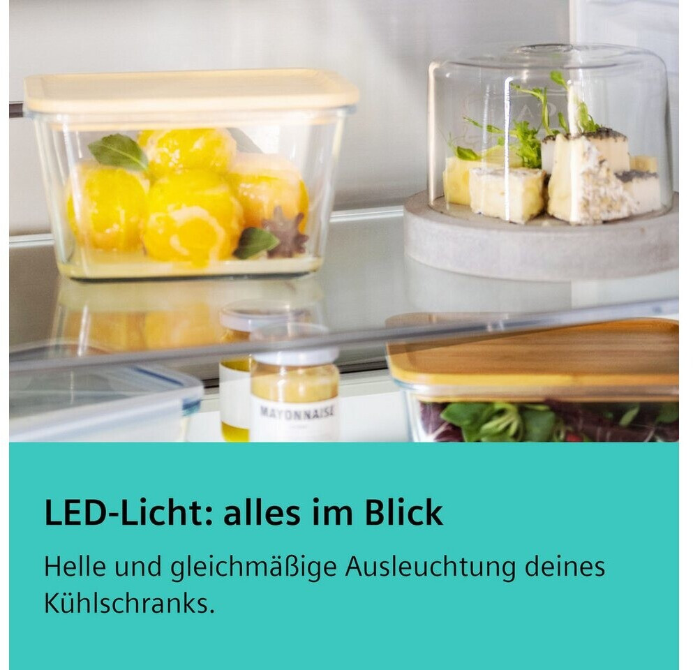 | Innenraum-Ausstattung | 0-Grad-Zone, Abstellflächen, Flaschenablage, Eierablage, Gefriergutschubladen, Gefrierfach, Gefriergut-Kalender, Innenraumbeleuchtung |